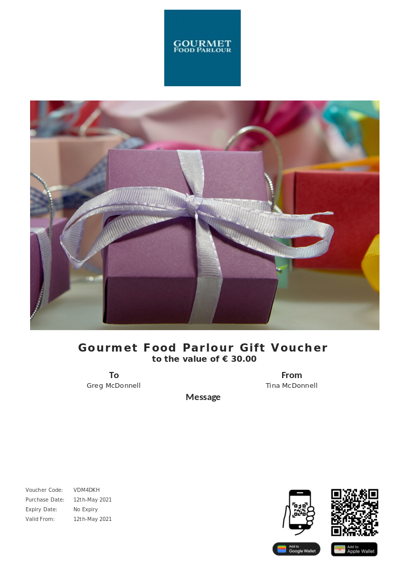 Gourmet Food Parlour allows you to purchase instantly printable gift vouchers, special offers and tickets using the Voucher Connect platform.